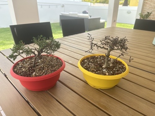Tristemente, eso fue justamente lo que nos pasó. Nos descuidamos un par de días y aquí pueden ver el resultado: mi bonsái (a la izquierda) todavía verde, y el de Cristina (a la derecha) seco.